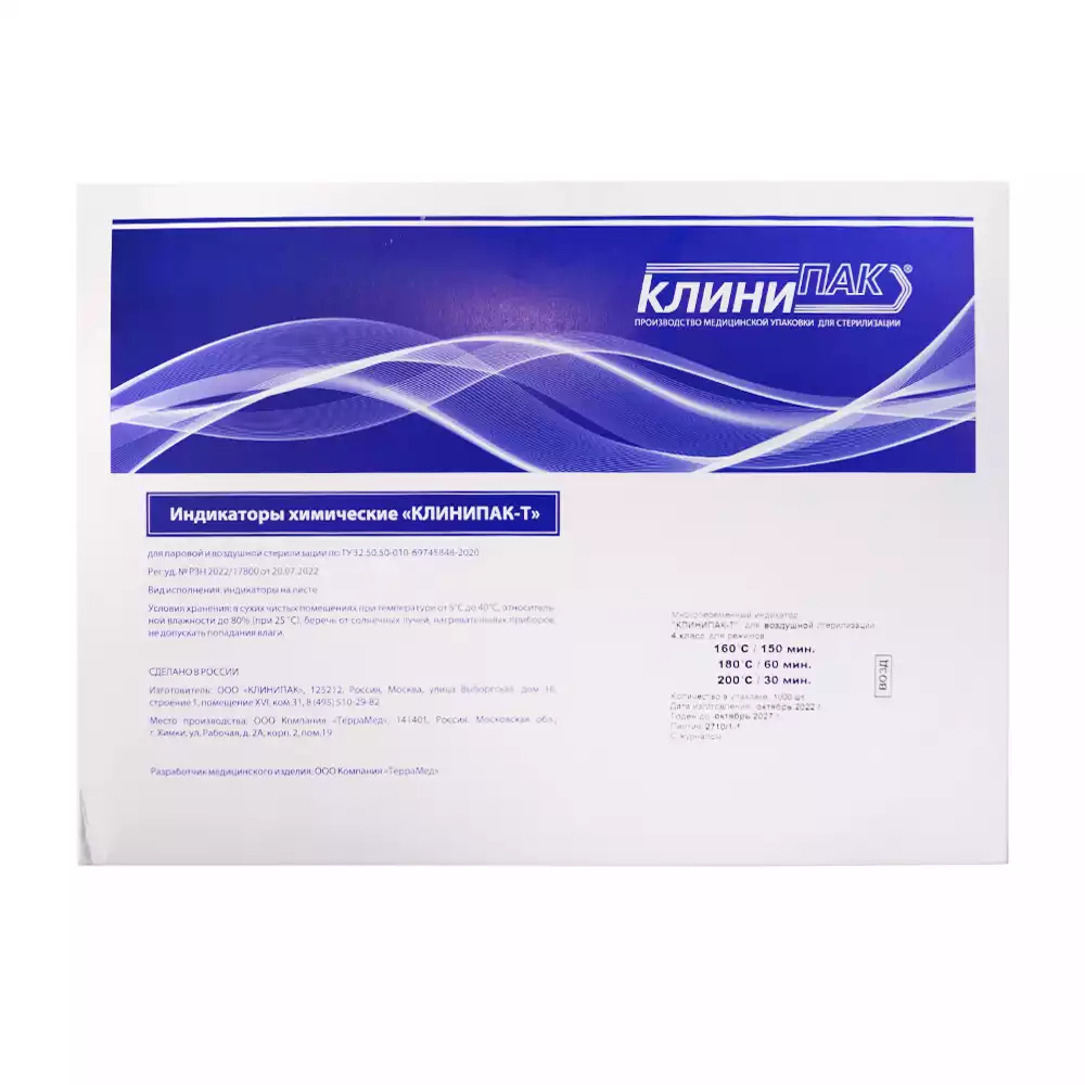Индикатор стерилизации КЛИНИПАК-Т универсальный, 4 класс (160C/150мин.,180C/60мин.,200C/30мин), самоклеющийся, упаковка 1000 тестов, с журналом, для контроля внутри и снаружиКЛИНИПАК (РОССИЯ)