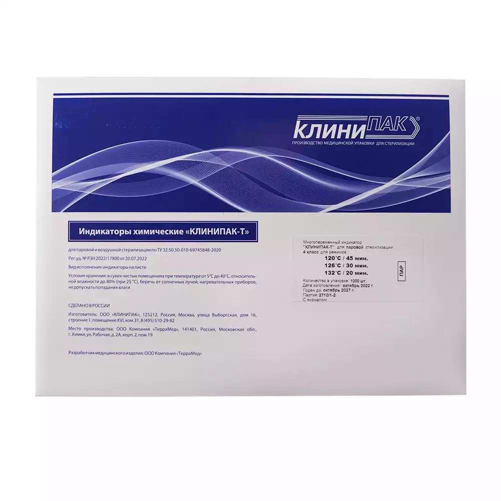 Индикатор стерилизации КЛИНИПАК-Т универсальный, 4 класс (120C/45мин.,126C/30мин.,132C/20мин), самоклеющийся, упаковка 1000 тестов, с журналом, для контроля внутри и снаружиКЛИНИПАК (РОССИЯ)