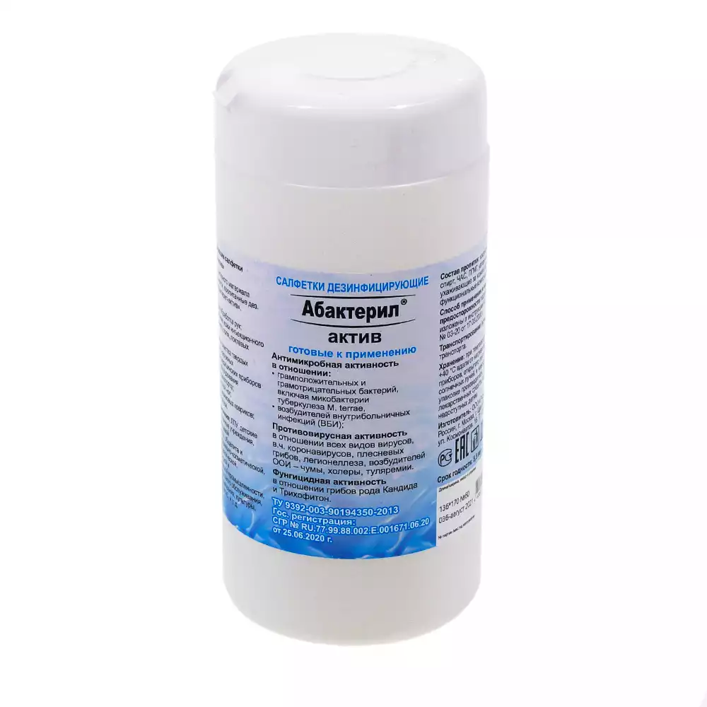 Салфетки "Абактерил - Актив", дезинфицирующие, размер 13,6*17см, в банке 60шт, готовые к применениюРудез (РОССИЯ)