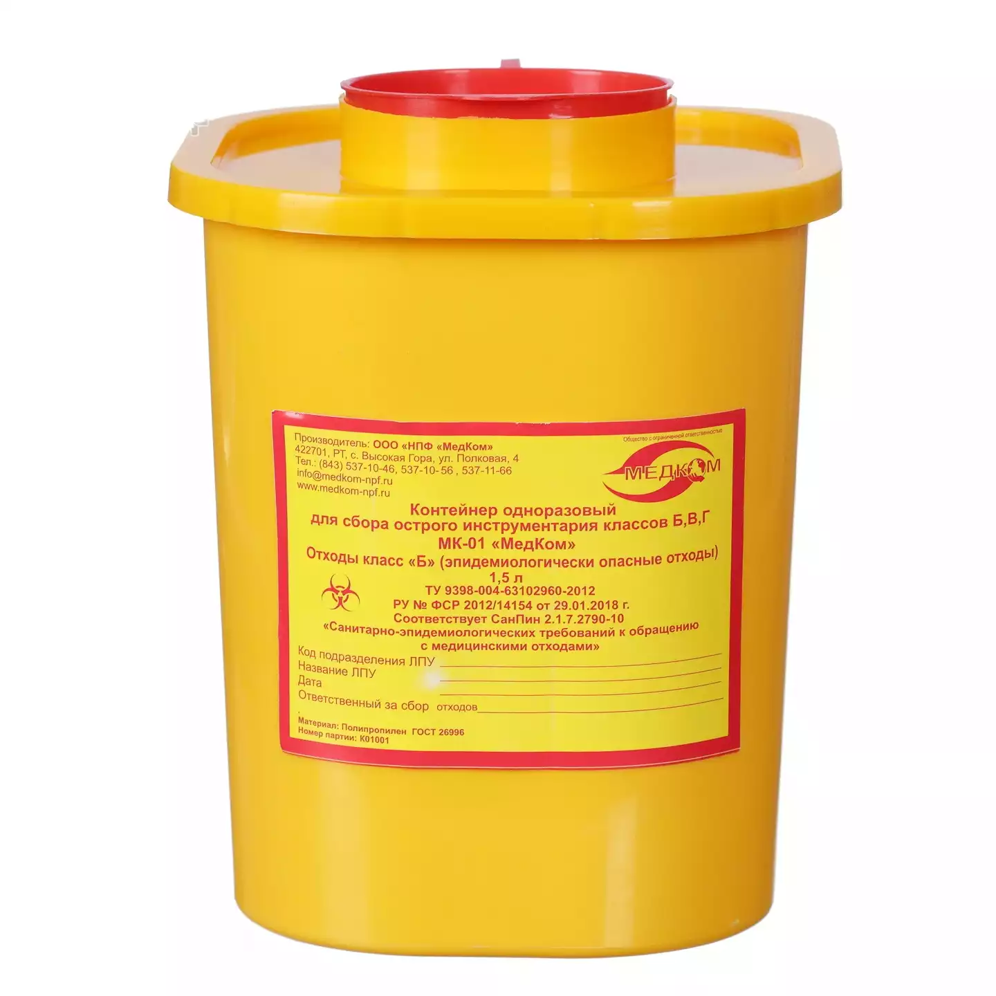 Емкость-контейнер для сбора острого инструментария (с иглосъемником), объем 1,5л (класс Б), желтая, одноразовая, МедКом НПФ (РОССИЯ)