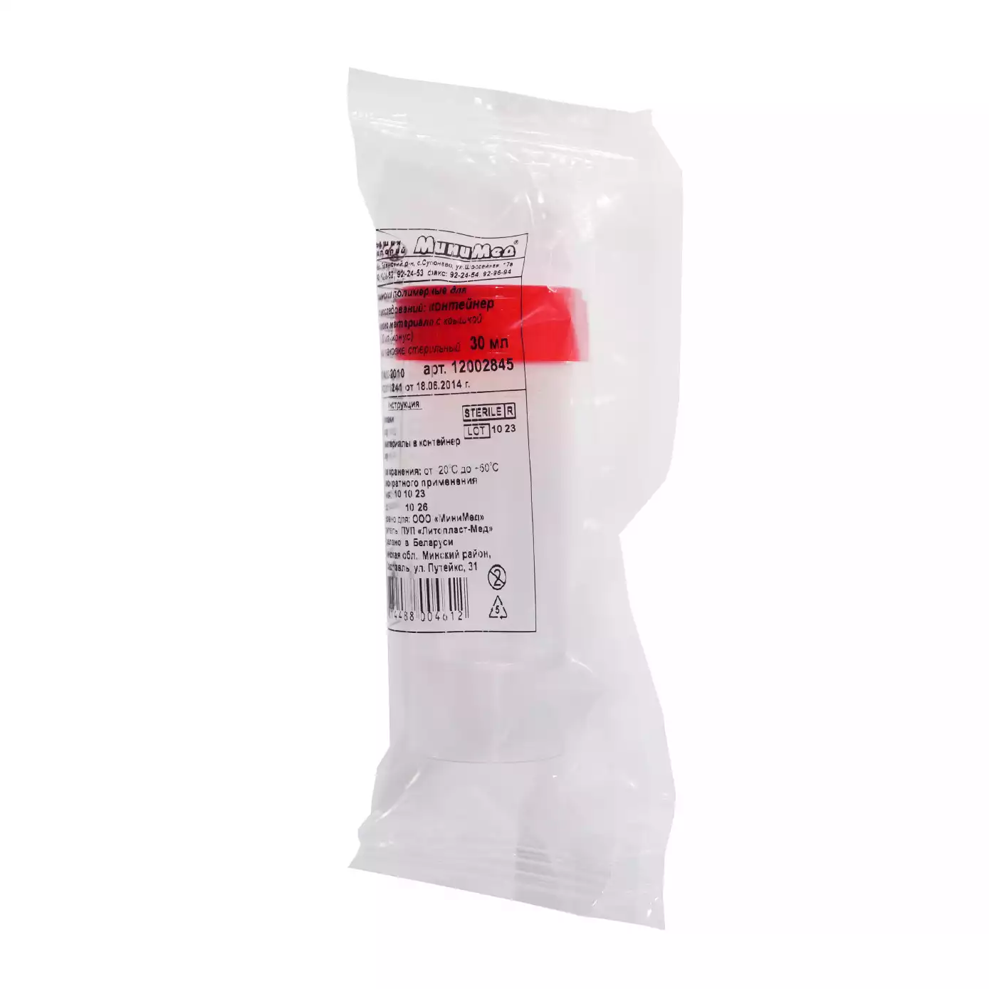 Контейнер 30мл, для взятия биоматериала, стерильный, с завинчающейся крышкой, без шпателя, индивидуальная упаковка, Литопласт-Мед УП (БЕЛАРУСЬ)