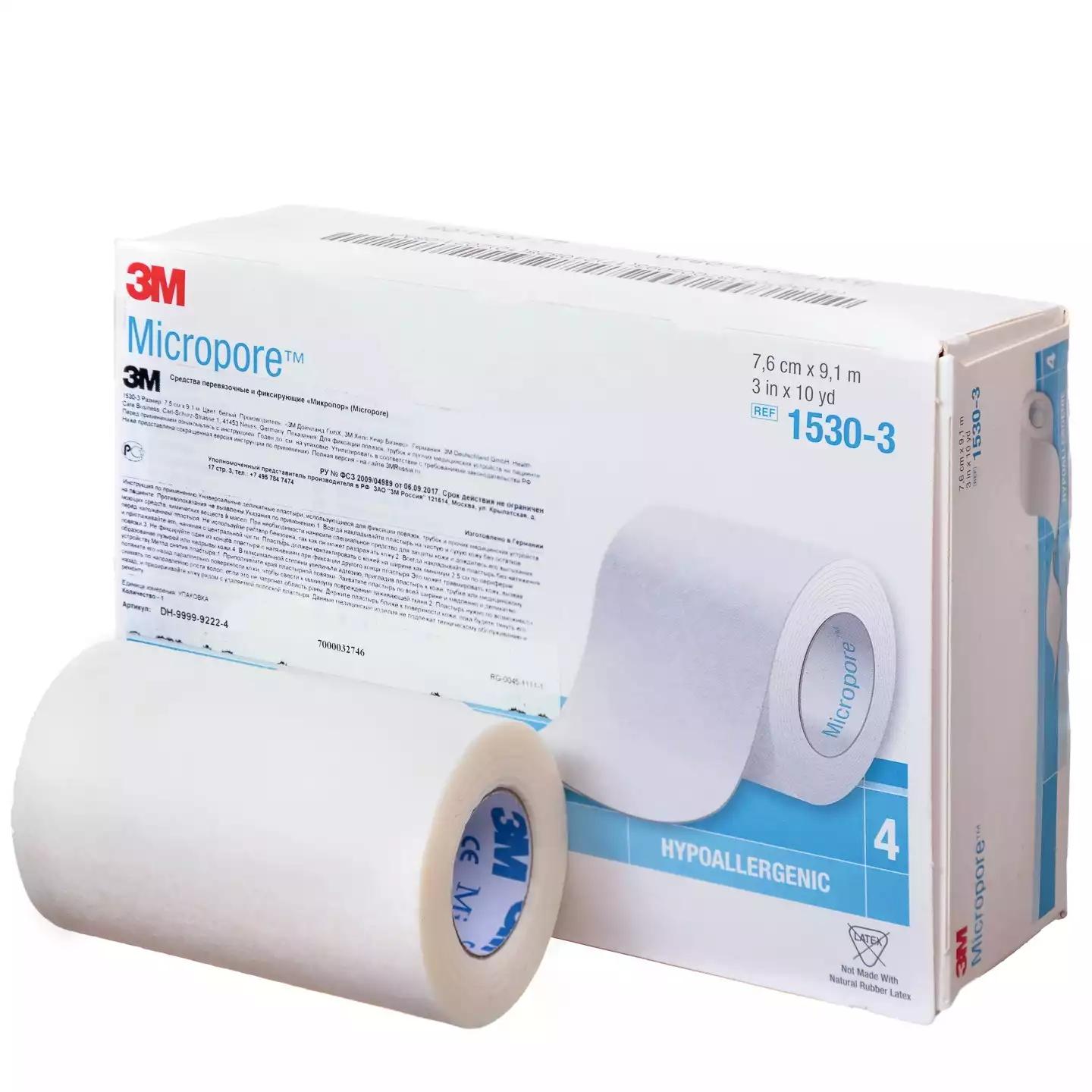Лейкопластырь Микропор нетканный, размер 7,5см*9,1м, белого цвета, упаковка 4шт, 3М (ГЕРМАНИЯ)