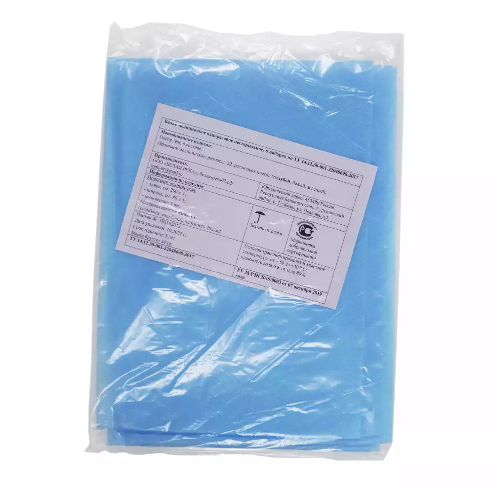Простыня 80*200см, материал Спанбонд 20г/м2, нестерильная, голубая, индивидуальное сложение, Белая река (РОССИЯ)