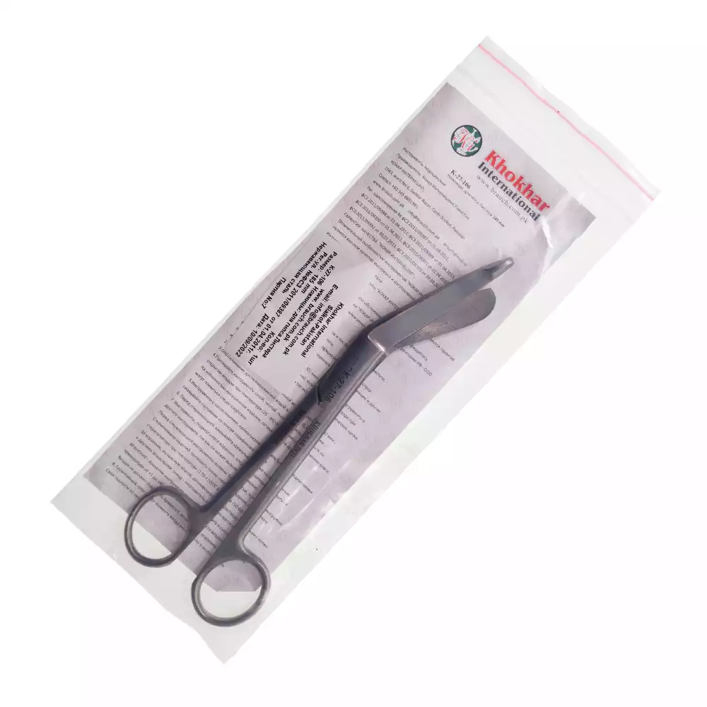 Ножницы К-27-106 тупоконечные горизонтально-изогнутые, для разрезания повязок, с пуговкой, длина 185мм, аналог Н-14, Khokhar International (ПАКИСТАН)