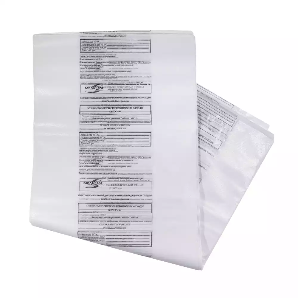 Каждый пакет оснащается специальным информационным окном для четкой идентификации и маркировки конкретного типа содержащихся в нем отходов, что дополнительно повышает безопасность обращения с ними.