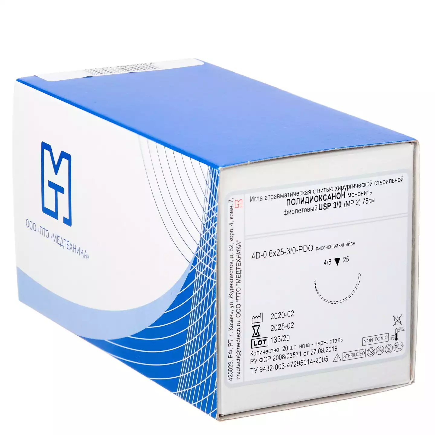 Полидиоксанон мононить USP 3/0 (МР 2), длина нити 75см, 4D-0,6х25-3/0-PDO цвет фиолетовыйМедтехника ПТО (РОССИЯ), 20 шт