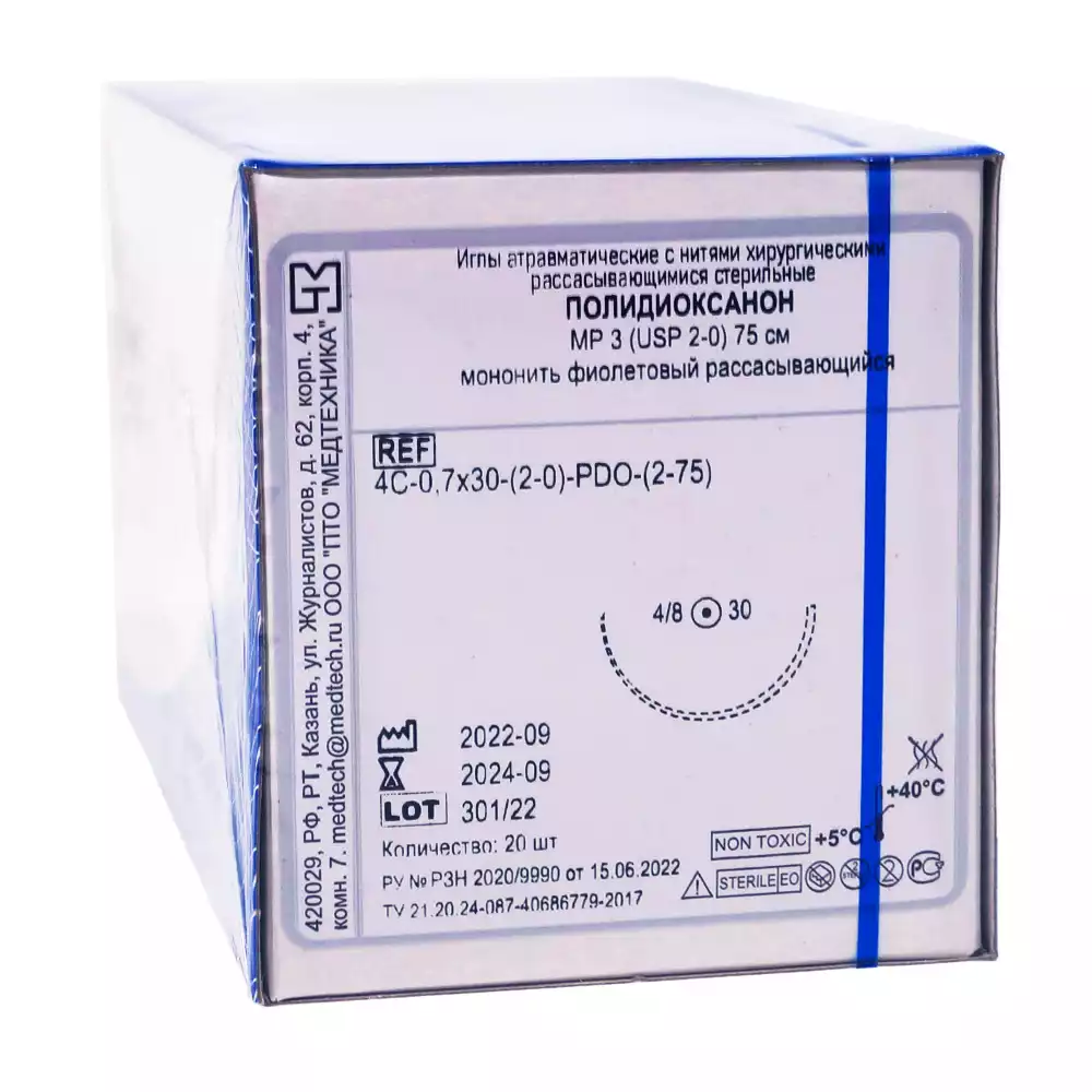 Полидиоксанон мононить USP 2/0 (МР 3), длина нити 75см, 4C-0,7x30-(2-0)-PDO-(2-75) цвет фиолетовыйМедтехника ПТО (РОССИЯ), 20 шт