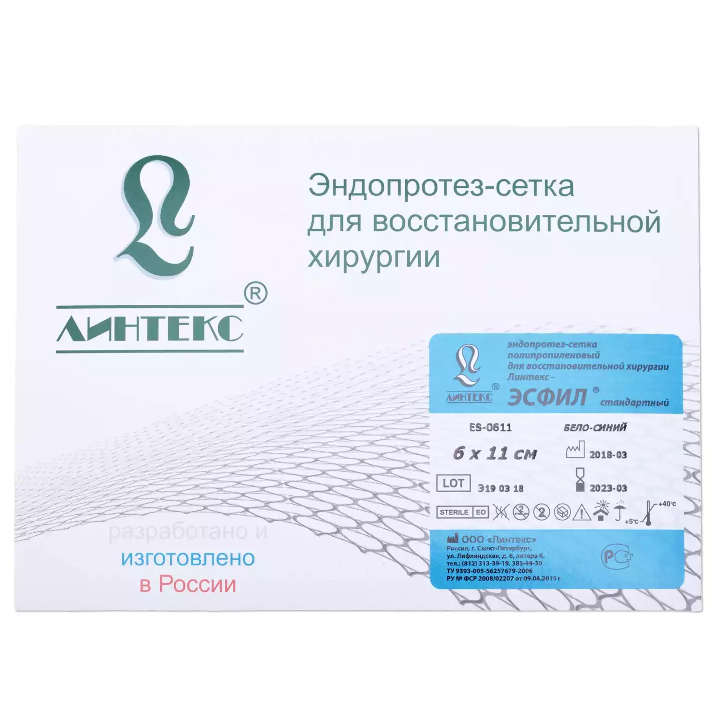 Эндопротез-сетка ЭСФИЛ стандартный, полипропилен, размер 6*11см, для восстановительной хирургии стерильная ЭСФИЛ стандартныйЛинтекс (РОССИЯ)