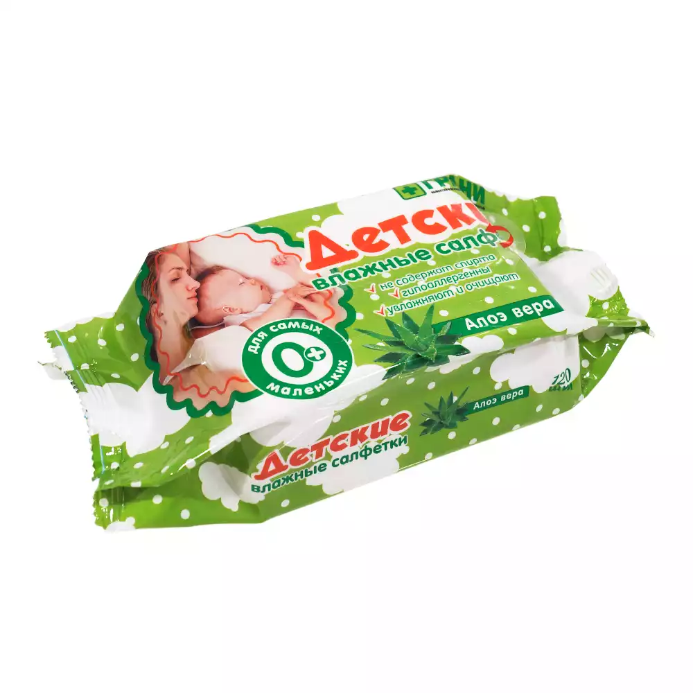 Салфетки влажные с Алоэ Вера, детские, гигиенические, не содержат спирта, размер 15*15см, упаковка 120шт, Грани (РОССИЯ)