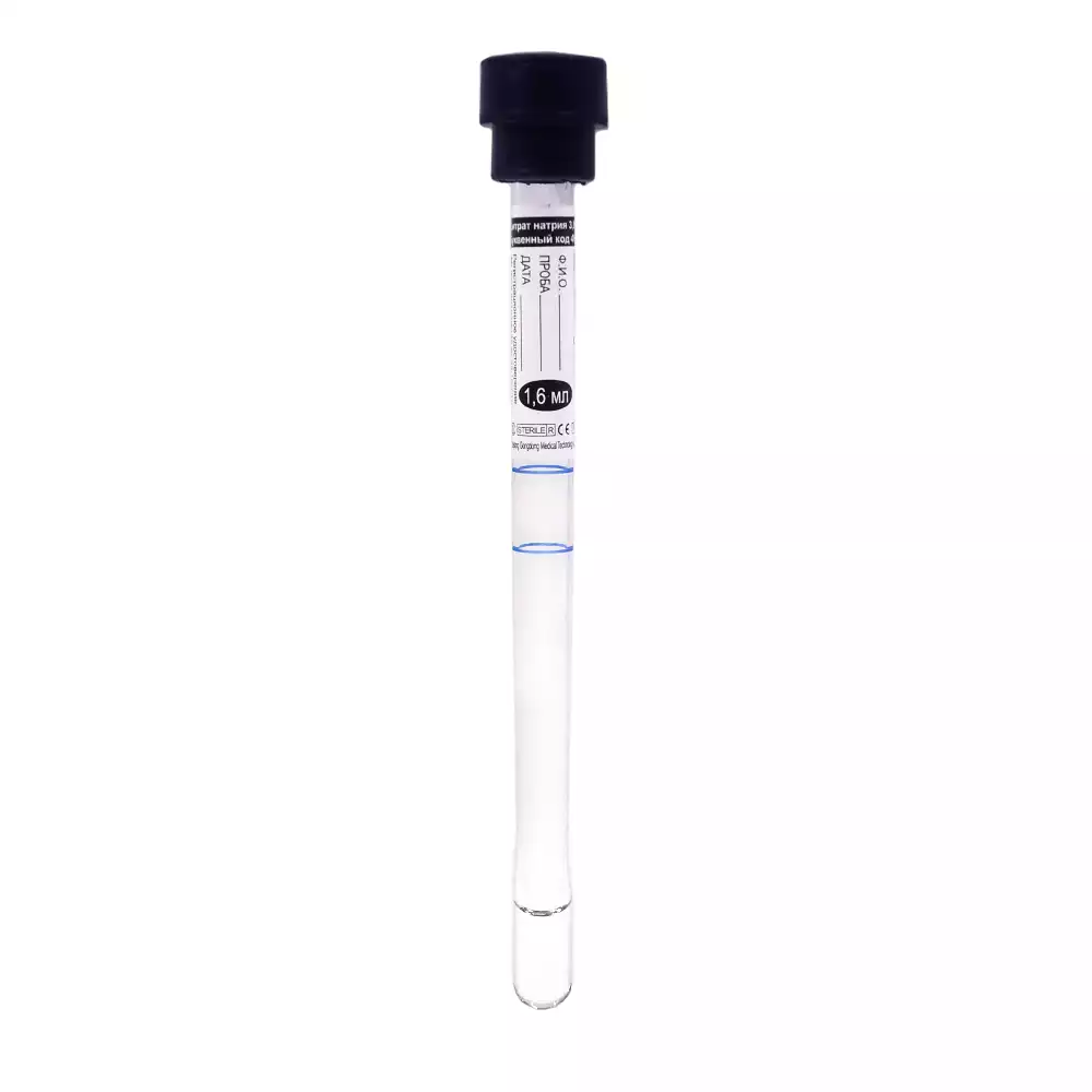 Стеклянная вакуумная пробирка объемом 1,6 миллилитра, стандартным размером 8 на 120 миллиметров, предназначена для определения скорости оседания эритроцитов (СОЭ) методом Вестергрена в ручном режиме. В качестве антикоагулянта используется раствор цитрата натрия с концентрацией 3,8% (0,129 моль/л), что обеспечивает точное и надежное исследование. Цвет пробирки — черный, что соответствует международной системе кодировки для данного типа реагентов.