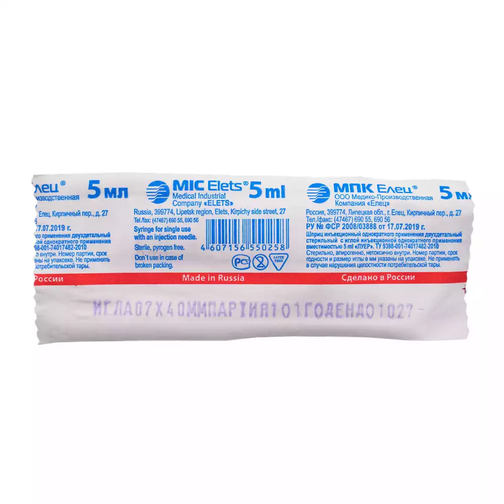 Шприц 5,0 мл, 2-х компонентный, игла 22G*1 1/2 (0,7*40мм) рядом, стерильный, 5 шт