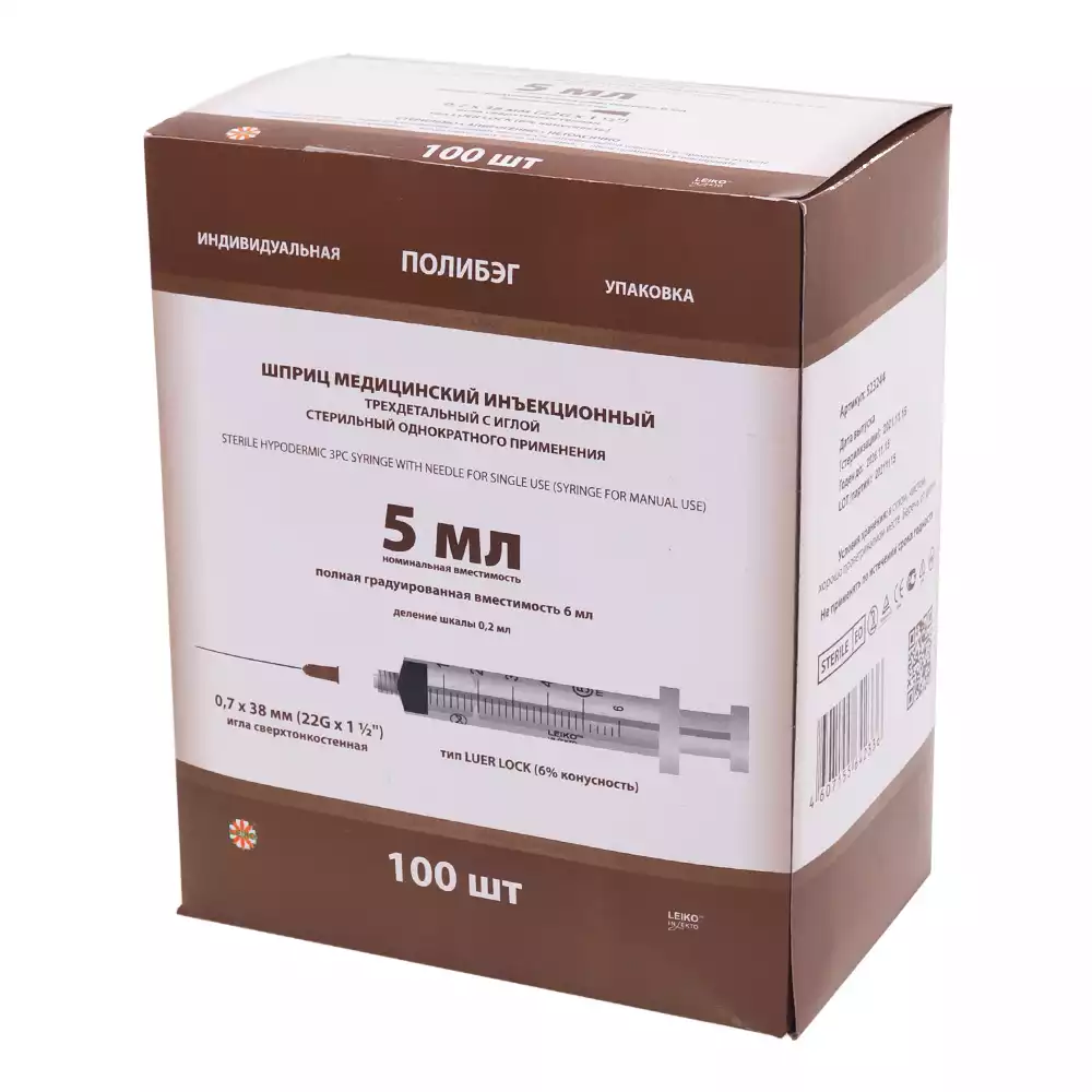 Шприц LEIKO 5,0мл, 3-х компонентный, игла 22G*1 1/2 (0,7*38мм), соединение Луер Лок, стерильный
