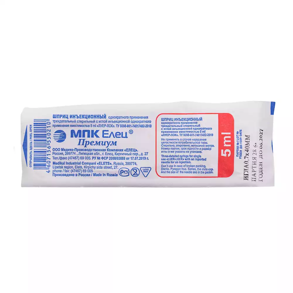 Шприцы инъекционные однократного применения трехдетальные стерильные, производства МПК "Елец", с иглами.